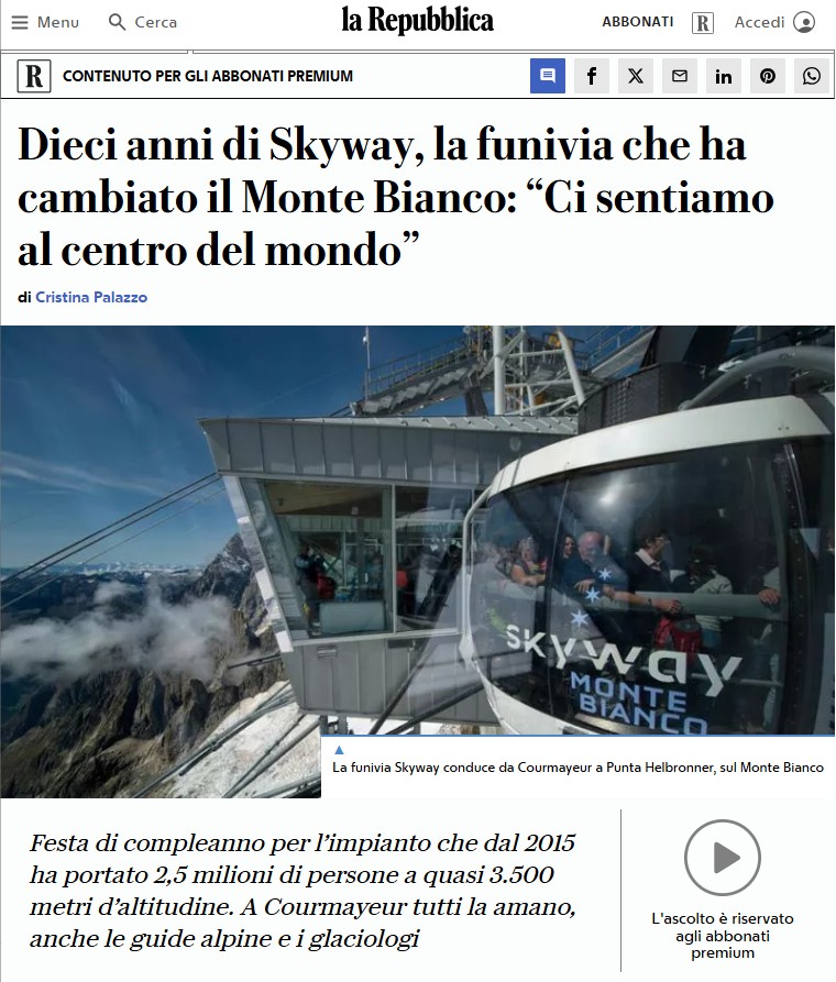 Su La Repubblica in occasione dei 10 anni dall'apertura dell'innovativo impianto di risalita sul versante italiano del monte Bianco è stato pubblicato un articolo scritto da Cristina Palazzo.