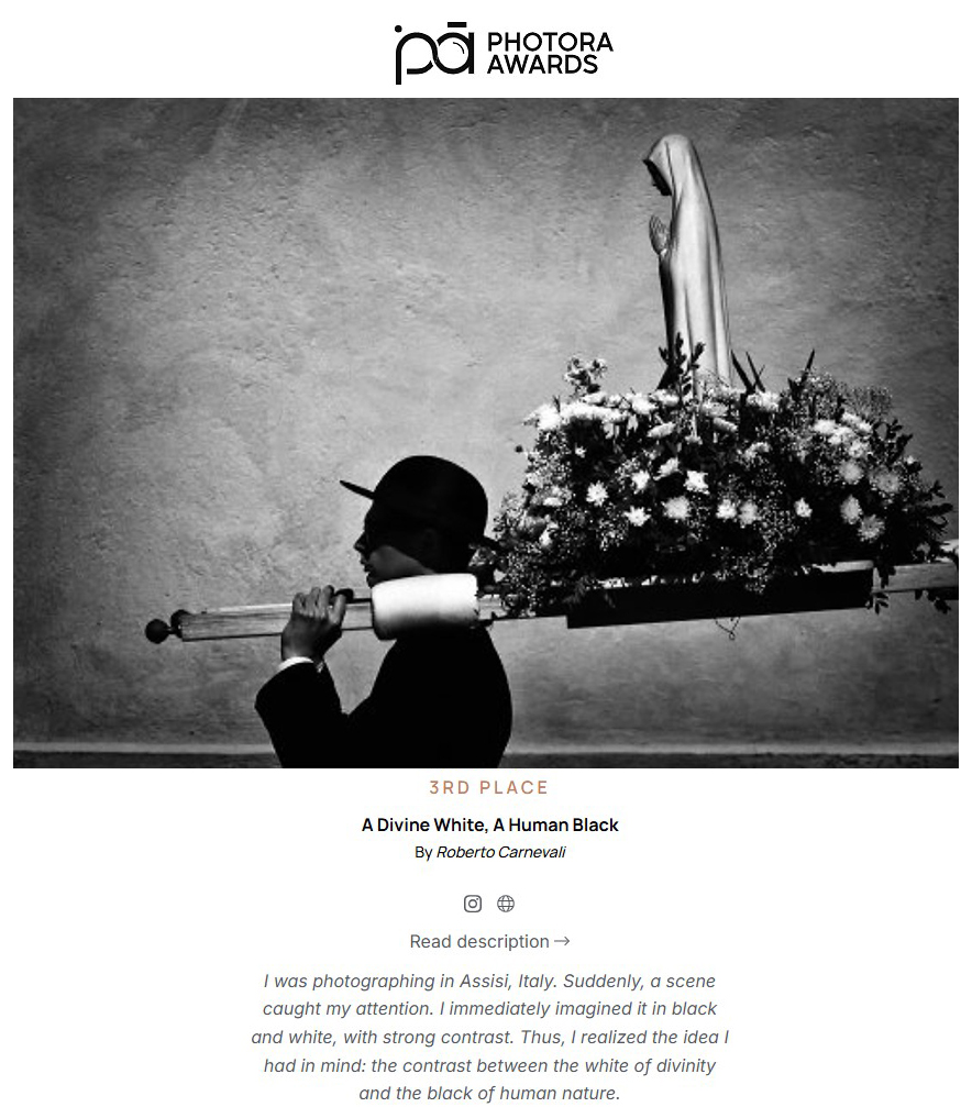 Ho ricevuto la comunicazione di essere tra i vincitori del concorso: la fotografia "A divine white, a human black" con cui ho partecipato nella categoria Street Photography è stata premiata con il terzo posto assoluto.