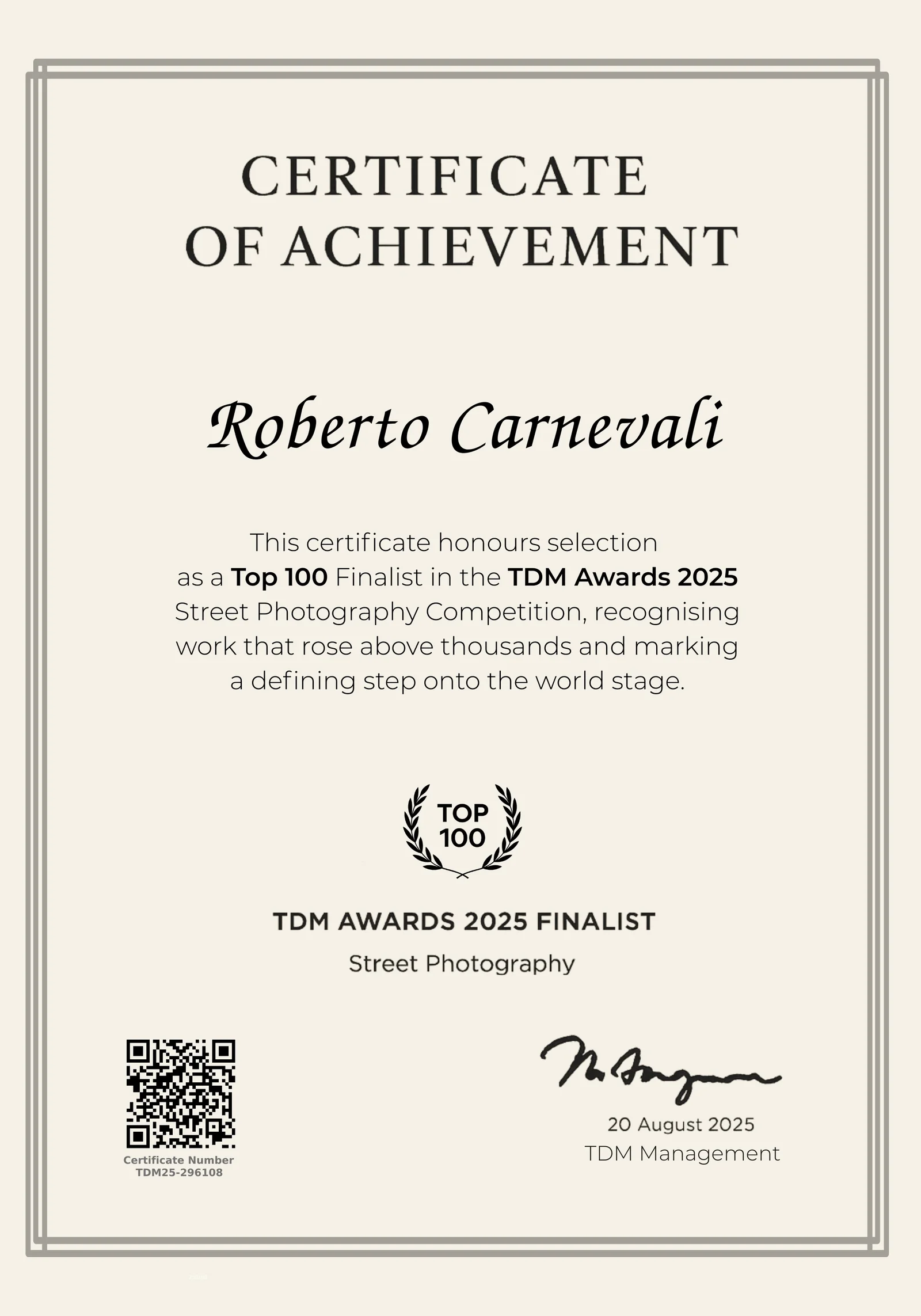 Il 20 agosto 2025 sono stati annunciati i vincitori del concorso fotografico internazionale di street photography di TDM Magazine. Nata nel 2019 questa rivista si ispira al lavoro del grande maestro Henri Cartier-Bresson e all'idea del "Momento decisivo". TDM è infatti l'acronimo di The Decisive Moment.