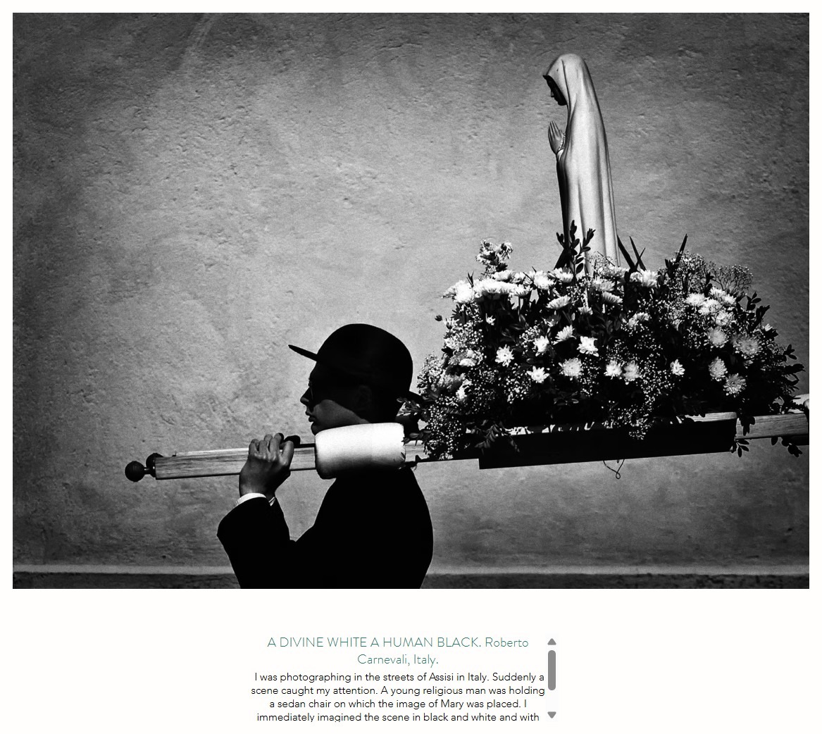 Nel settembre del 2009 stavo realizzando alcune immagini nel centro storico di Assisi. All'improvviso da un vicolo sbuca questa visione che esiste solo per pochi attimi, giusto il tempo di scattare rapidamente questa immagine. Ho concepito fin da subito in bianco e nero la fotografia. Mi ha colpito il contrasto netto tra il nero profondo del religioso che rappresenta l'umanità contrapposto al bianco candido del divino.